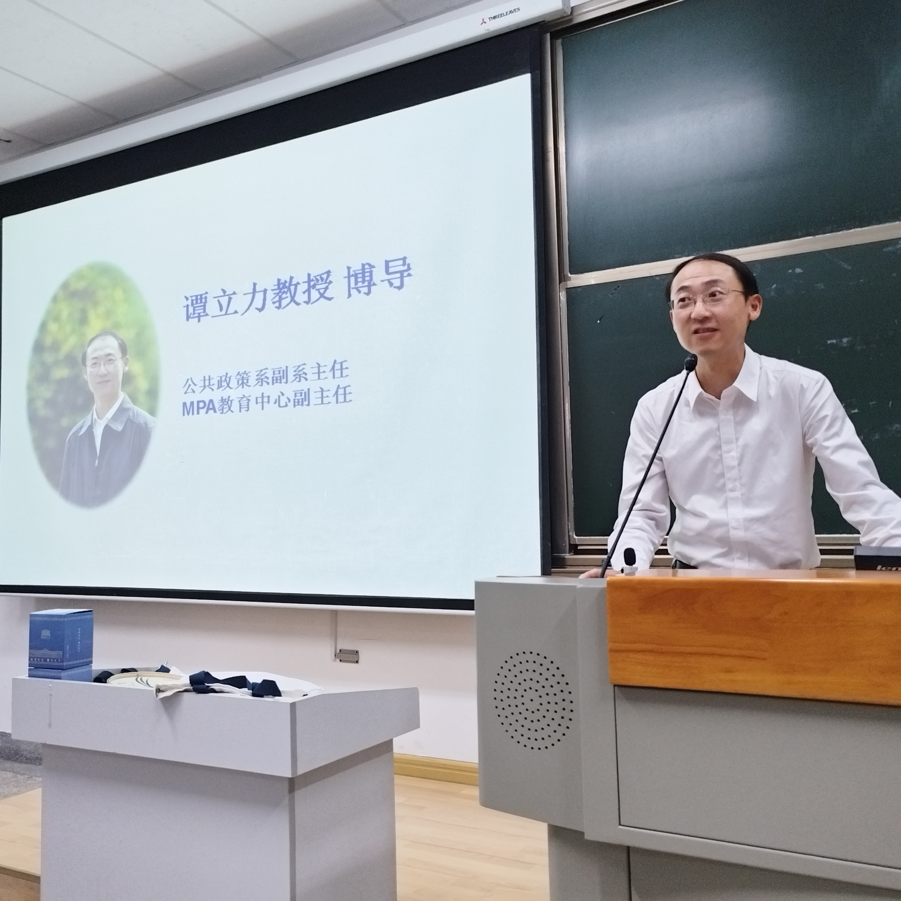 MPA教育中心副主任谭立力教授代表全体教师发言,希望新生强化自我管理、遵守学校规章,弘扬“从游”文化、促进教学相长,同时,度过一段美好、难忘的校园生活,不负青春、不负时代。