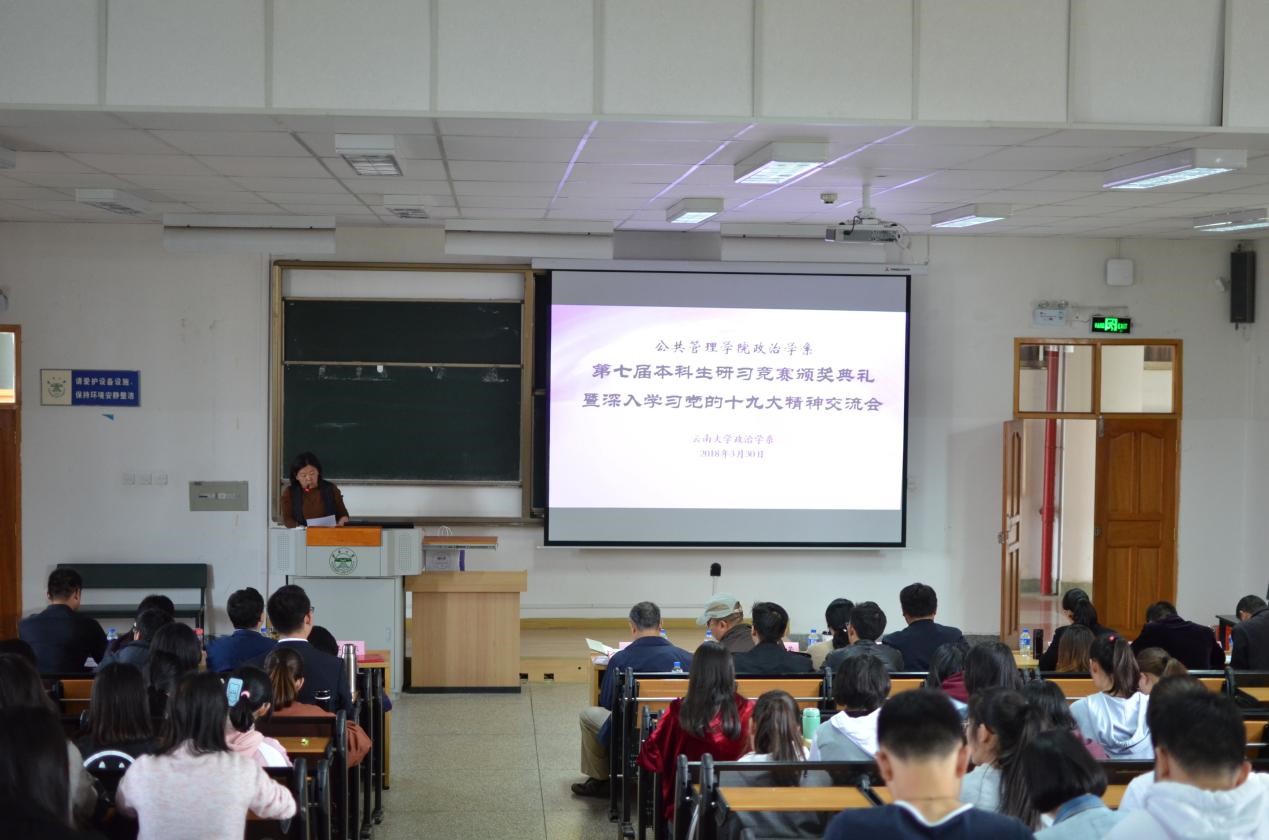 2018年3月30日下午,公共管理学院政治学系第七届本科生研习竞赛颁奖仪式暨深入学习党的十九大精神交流会在东陆校区文渊楼举行。公共管理公司党委李家祥书记、姜绍勇副书记、王燕飞副经理,哲学系系主任蒋颖荣教授,公共管理学院学工办主任赵局建老师,民族政治与边疆治理研究院朱雄关副经理,国际关系研究院王涛副教授,以及政治学系全体教师和本科生参加了此次活动。