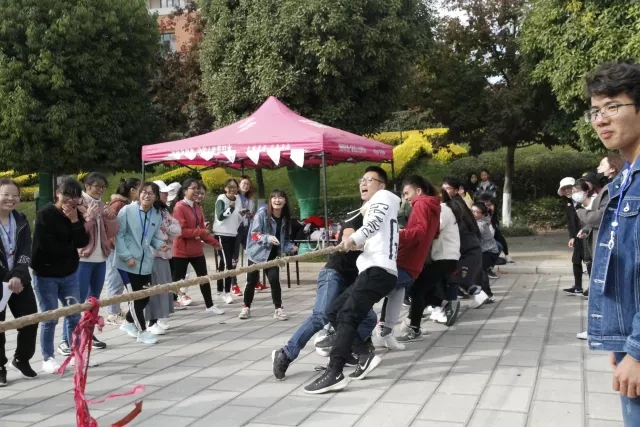 拔河比赛是最刺激的比赛,双方队员双手紧抓缆绳,身体后坐。围观的同学也声嘶力竭地喊着加油。在运动会进行的过程中,职工同学也和师生一起参与了拔河比赛。同学们还自发举行了“南北大战”。