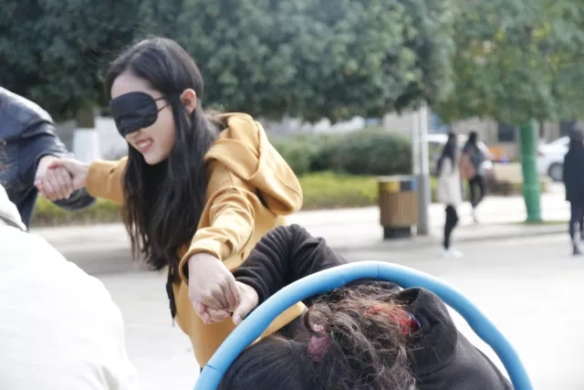 你和你的队友默契如何呢?这是一个蒙眼游戏。呼啦圈在每个“盲人”之间传递,老师和同学们努力配合,在游戏过程中提高了默契,增进了情感。
