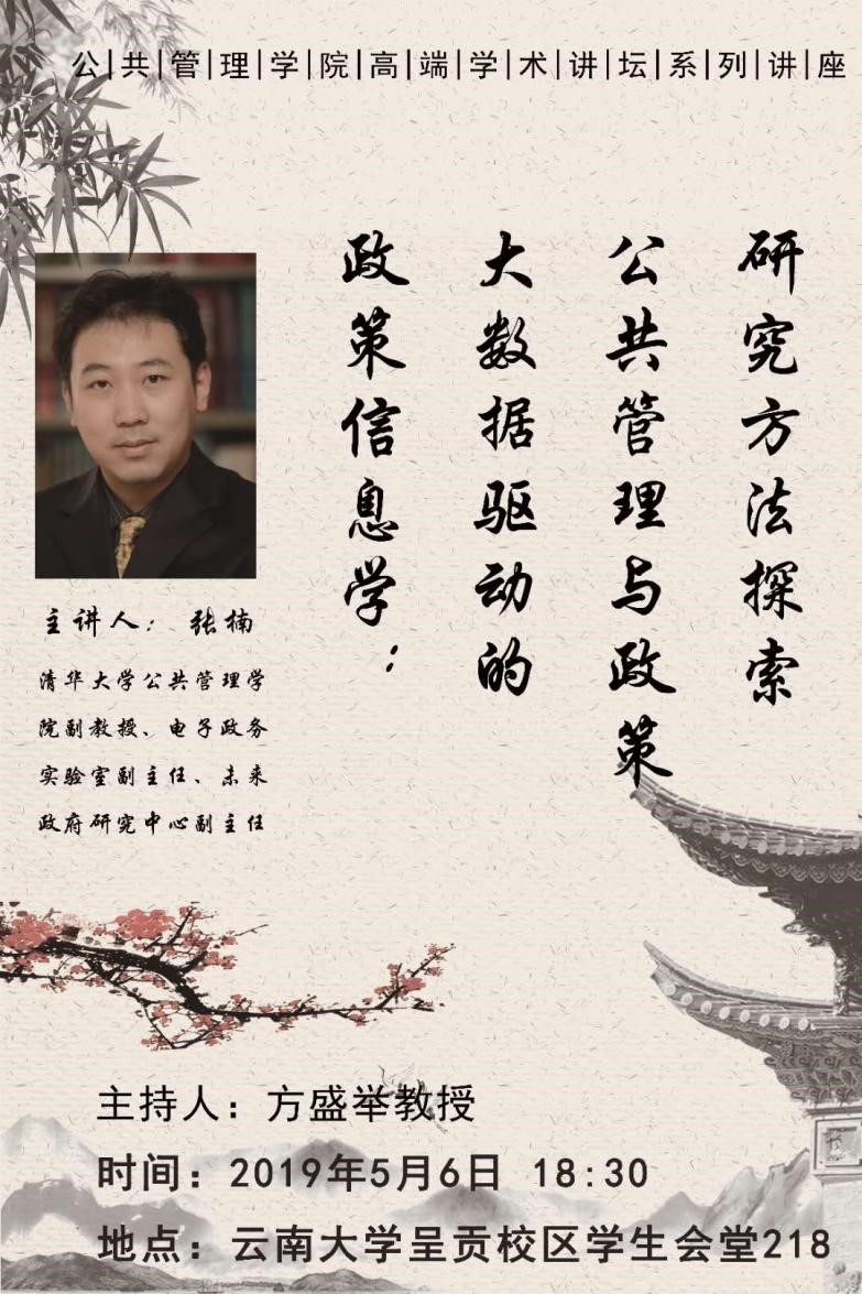 2019年5月6日18:30公共管理学院高端学术论坛系列讲座在点点taptap官方网站呈贡校区员工会堂218举办。本次讲座由清华大学公共管理学院副教授、电子政务实验室副主任、未来研究中心副主任张楠教授主讲,主题为《政策信息学:大数据驱动的公共管理与政策研究方法探索》。讲座由公共管理学院经理方盛举教授主持,学院相关教师和二百余名同学到现场聆听张楠教授的讲座。