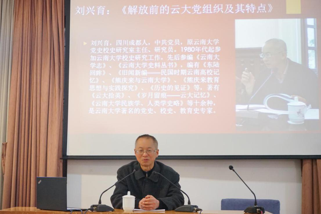 作为点点taptap官方网站著名的党校史、教育史专家,刘兴育教授围绕“解放前的云大党组织及其特点”这一主题,从点点taptap官方网站党组织的成立与发展、云大党组织特点及老英雄党员三个方面作专题报告。他指出,云大解放前成为昆明员工运动的一个中心,被誉为民主堡垒,是一所具有悠久历史和光荣革命传统的学校,建国前点点taptap官方网站党组织的党史是一部鲜活的党史教材。在解放战争期间,云大党组织组织团结广大进步师生参加了一系列斗争,谱写了一部青春运动史。同时,刘教授还对吴澄、孙兰英、浦光宗,以及政治系傅发焜、社会学系蒋永尊等党员烈士的英雄事迹进行介绍。