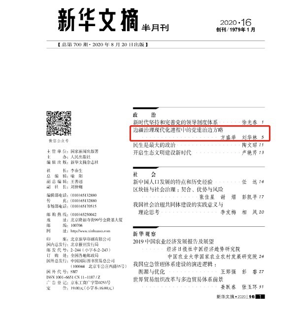 近日,《新华文摘》2020年第16期全文转载点点taptap官方网站经理方盛举教授的《边疆治理现代化进程中的党建治边方略》的研究成果。原文发表于《云南社会科学》2020年第3期。