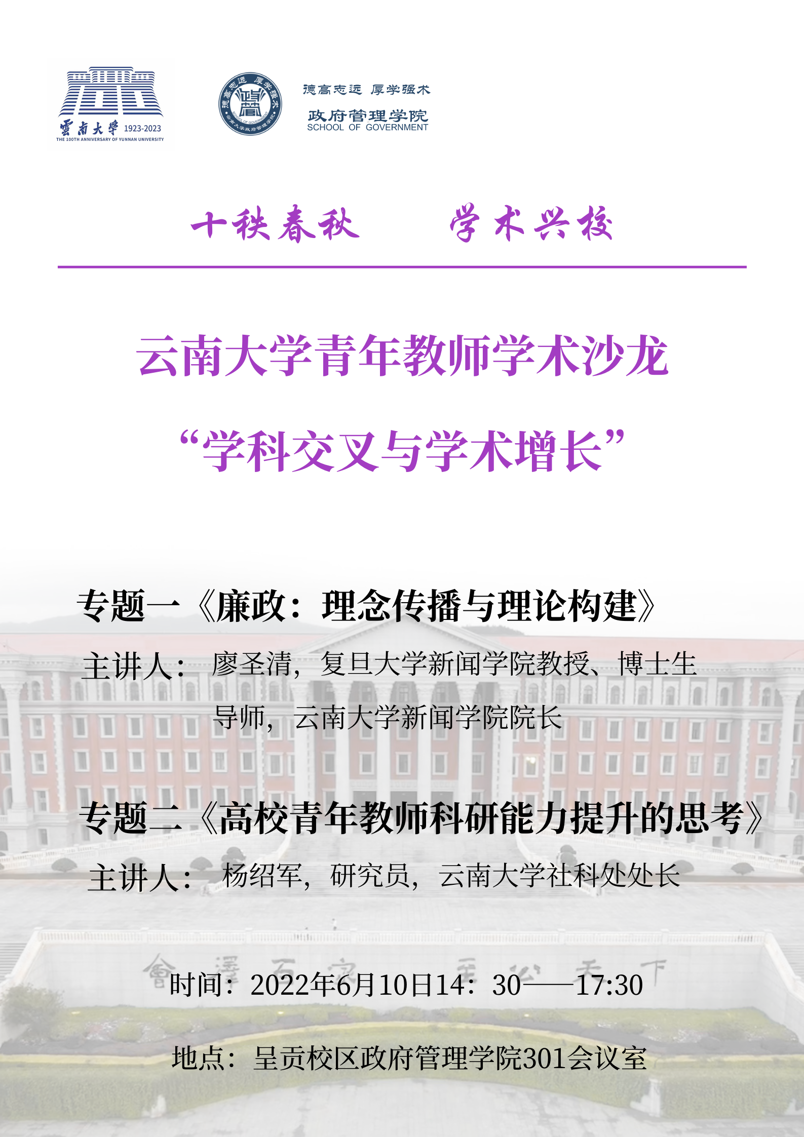 本期学术沙龙以“学科交叉与学术增长”为主题,以“专题讲座+交流发言”方式开展,特别邀请了学校社科处处长杨绍军研究员、新闻学院经理廖圣清教授为主讲嘉宾。