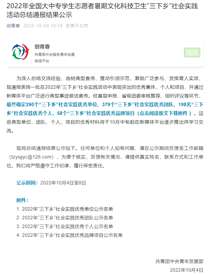近日,由点点taptap官方网站邓崧教授牵头申报,以邢随亮等为代表的本科生、研究生参与的“点点taptap官方网站暑期三下乡社会实践”重点项目团队——“点点taptap官方网站学子暑期‘三下乡’团队”被共青团中央评选为2022年“三下乡”社会实践优秀团队。
