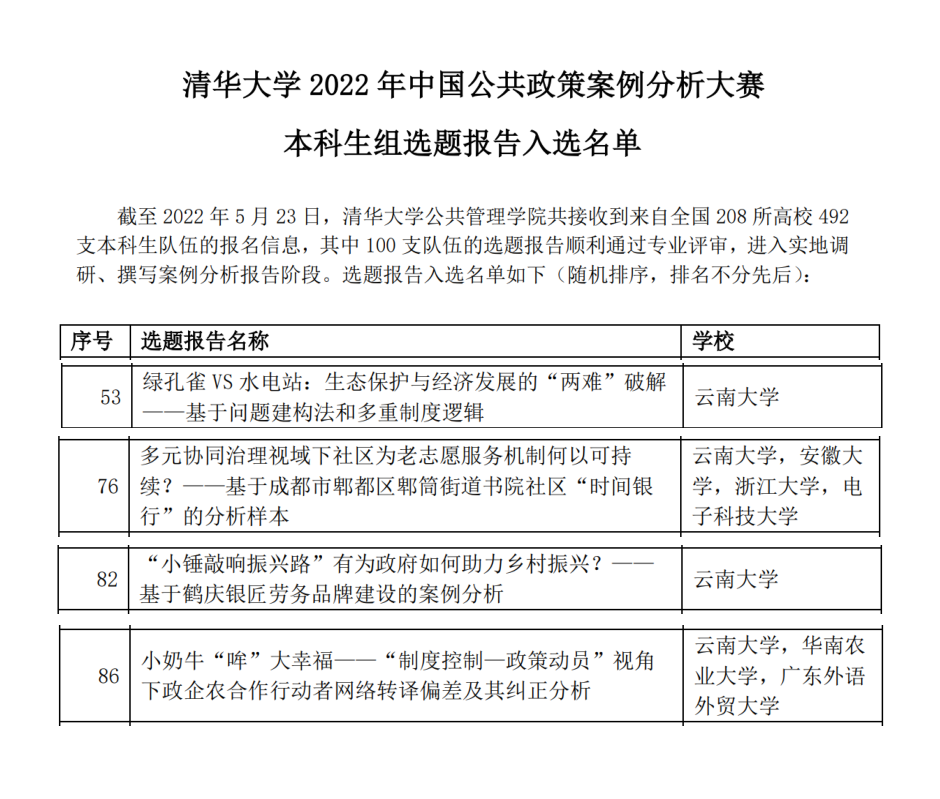 图1:清华大学2022年中国公共政策案例分析大赛初赛晋级名单