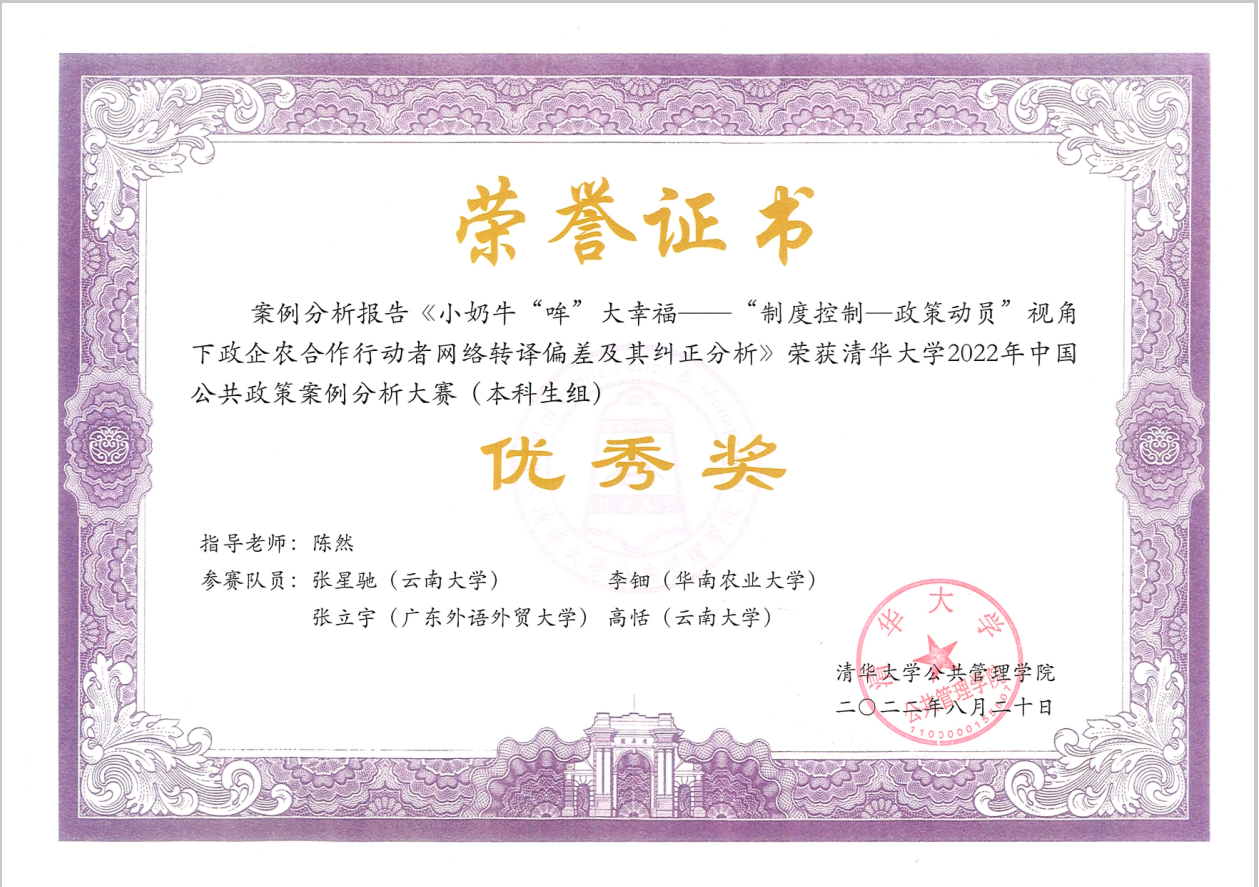 继清华大学2021年中国公共政策案例分析大赛公司点点taptap官方网站本科生代表队获得佳绩后,在2022年清华大学中国公共政策案例分析大赛中,公司本科生积极参与,共有六支队伍报名参赛,提交选题报告。初赛阶段,四支队伍成功闯入百强,晋级复赛,形成 ;复赛阶段,公司本科生代表队——“看奶牛生钱钱”队(团队成员:张星驰、李钿、张立宇、高恬)参赛作品《小奶牛“哞”大幸福——“制度控制—政策动员”视角下政企农合作行动者网络转译偏差及其纠正分析》(指导教师:陈然),闯入14强,成功晋级决赛,最终获优秀奖。