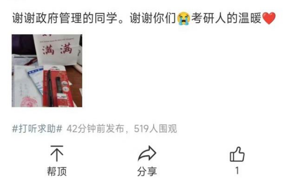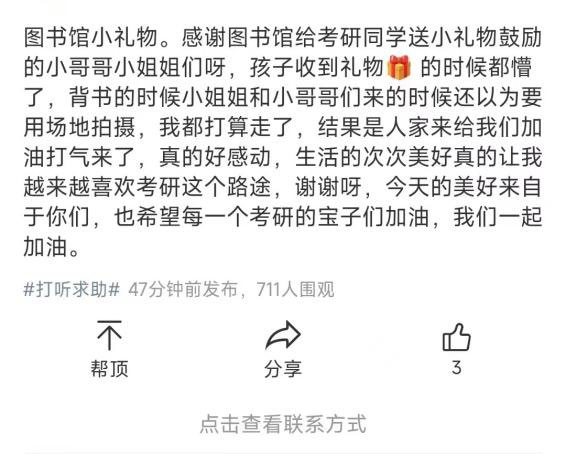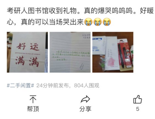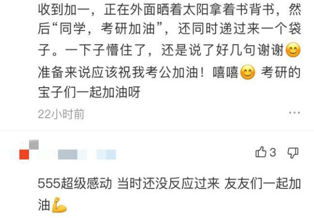 习近平总书记曾说:“雷锋精神,人人可学;奉献爱心,人人可为。”参与活动的志愿者们在“考研加油包”发放结束后纷纷表示,通过参加此次活动,自己更加懂得了善意和温暖的力量、参与志愿活动的价值和意义,并将在之后用自己的实际行动,继续弘扬奉献、友爱、互助、进步的志愿精神,书写新时代青年的志愿故事。同时,在校园社交平台上,很多考研学子也传递了他们收到礼物后的致谢和感想。