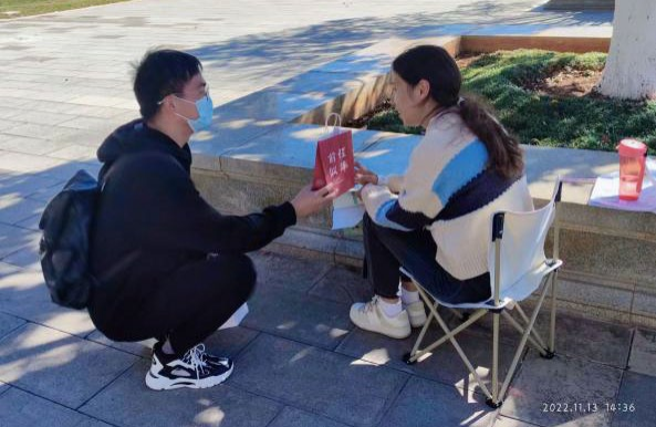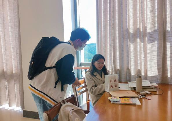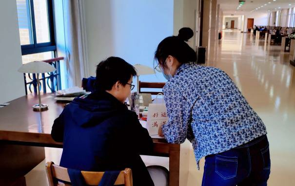 活动开展过程中,为了不扰乱图书馆秩序,影响同学们学习备考,支部将志愿者们分为四个小组,各小组成员佩戴口罩,有序安静地进入图书馆的不同楼层进行礼物发放。图书馆西区一楼小院子和电影院二楼是考研学子最集中的地方,大部分考研学子都会在这里背书学习。其他楼层的考研学子坐得相对分散,志愿者们主要通过观察同学桌上的书籍来判断他们是否正在备考。每当看到有同学在大声背书或观看相关的考研视频和书籍,志愿者们都会向考研的同学送上一份“加油包”,并轻声鼓励道:“同学,考研加油!”收到礼物的考研学子们非常惊喜和感动,表示自己在接下来的考研冲刺期会更加努力,一定争取圆梦。