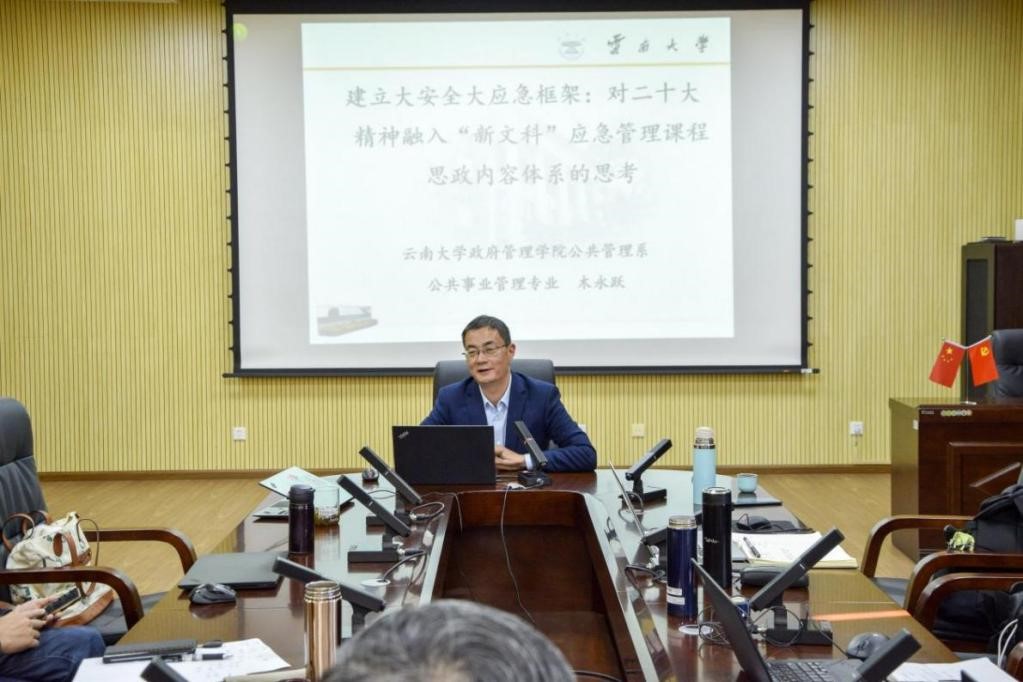 学院分管本科教学副经理、公共事业管理专业负责人木永跃副教授,将目光聚焦于二十大精神应急管理方面内容,进行了“建立大安全大应急框架:对二十大精神融入‘新文科’应急管理课程思政内容体系的思考”的主题发言。木老师将习近平总书记关于风险管理,应急管理的重要论述与新文科核心课程《应急管理概论与实训》进行深度融合,并对“新文科”应急管理的具体教学内容、课程思政元素、过程性考核与实践教学环节等内容进行系统设计。提出:一是要构建理论学习和实践教学相结合的课程内容体系,将基础知识与“思维能力”训练相结合,由点到面进行思政教育;二是要构建风险管理与应急管理的思政育人体系,将思政元素融入“三全育人”、“三阶育人”全过程;三是要把过程性考核与非标准答案考核有机结合,根据教学内容,优化考核方式,构建应急管理“知识—能力—素质—思维—人格”的课程教学目标与考核体系。