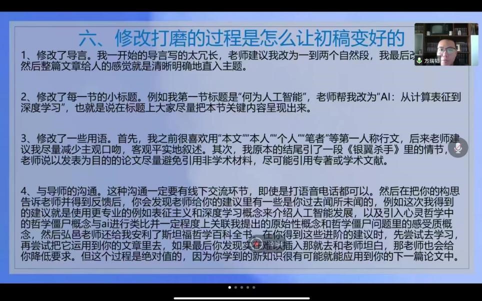 2022级研究生方瑞韬同学以自己的小论文《论AI诗歌创作原始性的匮乏》为例分享小论文的写作经验。