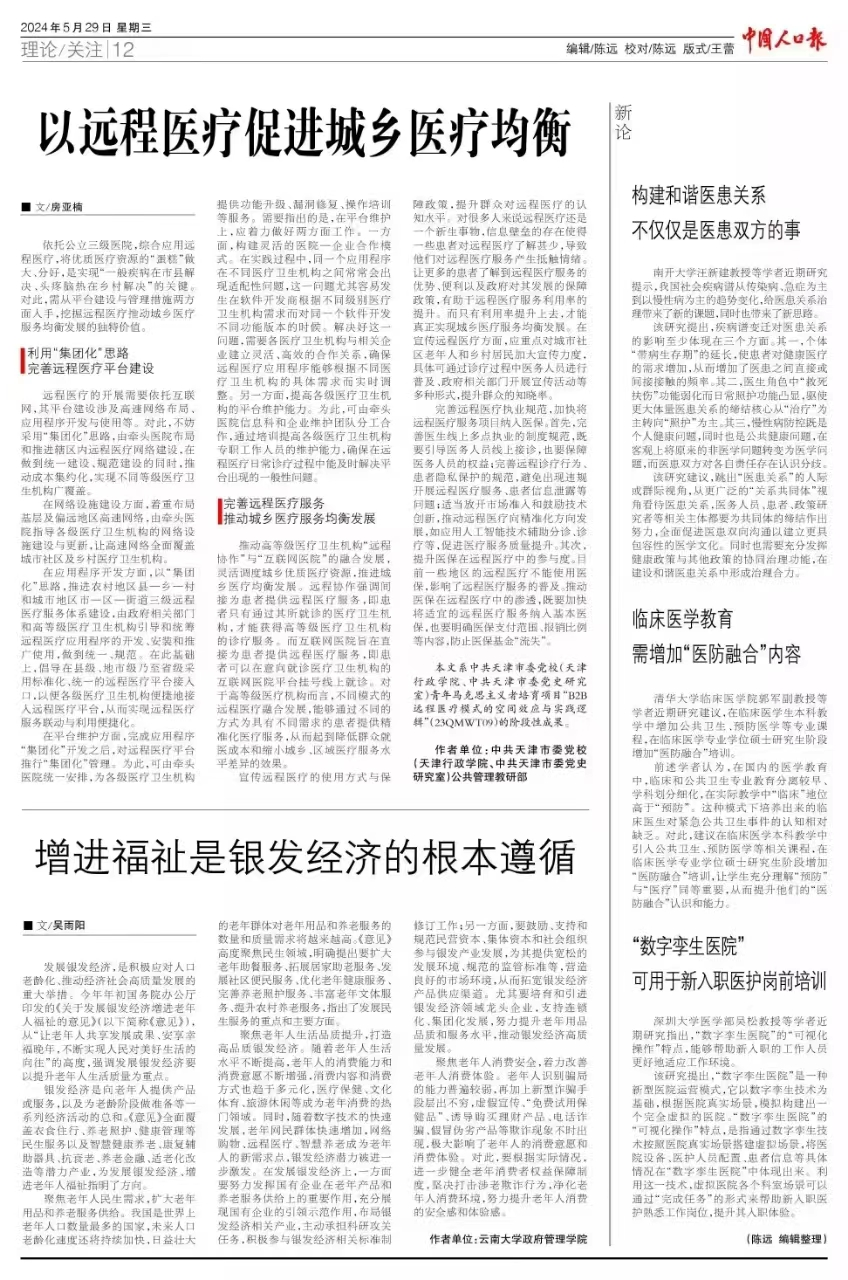 点点taptap官方网站2023级公共事业管理+地理信息科学专业本科生吴雨阳同学在2024年5月29日出版的《中国人口报》(理论版)发表了题为《增进福祉是银发经济的根本遵循》的学术论文。