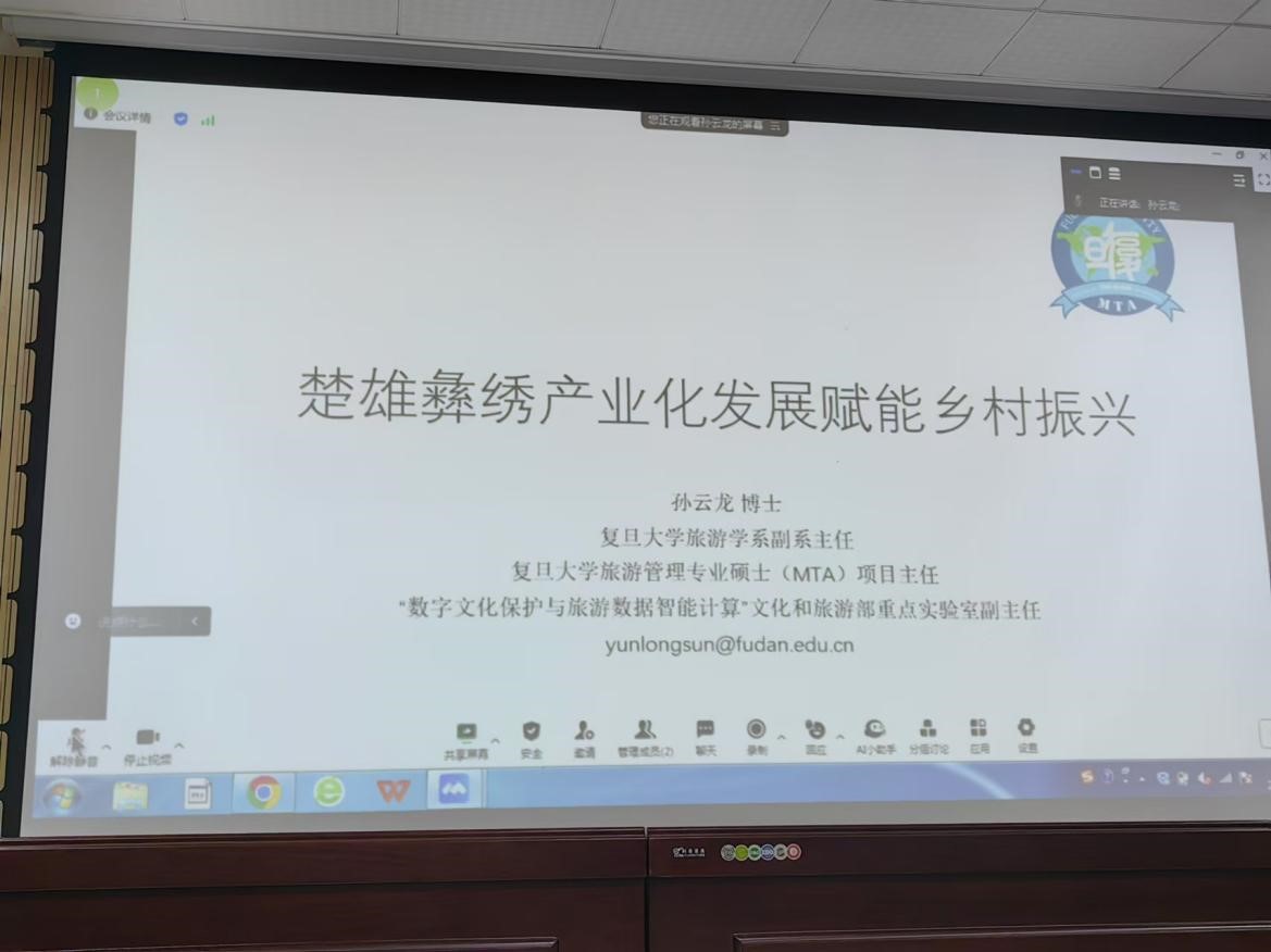 随后,复旦大学旅游学系副主任、旅游管理专业硕(MTA)项目主任、“数字文化保护与旅游数据智能计算”文化和旅游部重点实验室副主任孙云龙博士为大家做《楚雄彝绣产业化发展赋能乡村振兴》专题讲座。孙云龙老师强调,西部是旅游业最集中的地方,习近平总书记在西部大开发座谈会和对旅游工作的重要指示中都强调了推动旅游业高质量发展的重要性。孙云龙老师以玲娜贝尔、熊本熊等大热IP为例引出了当时策划楚雄彝绣IP 的可行性和必要性,并介绍到他们通过提升楚雄彝绣赛装接的定位升级进而支持了楚雄州以彝绣为主的特色文化产业发展,以“传统技艺+现代创意”全力推动楚雄彝绣实现了经济效益和社会效益的双丰收,使“千年彝绣,一绣千年”的文化传承发展成为惠及5万绣娘的指尖经济。