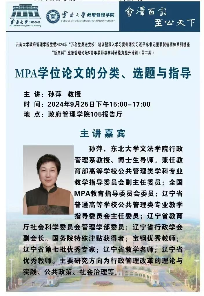 MPA教育为国家治理体系和治理能力现代化提供人才保障,而论文写作是培养“特别能调研、特别能写作,特别能做群众工作”的优秀公职人员的重要环节。为了提升公司MPA导师的指导能力和MPA员工的论文写作能力,学院特邀教育部高等学校公共管理类学科专业教学指导委员会副主任委员、全国MPA教育指导委员会委员、东北大学文法学院孙萍教授,在公司105报告厅开展《MPA应用型学位论文的分类、选题与写作》专题讲座。