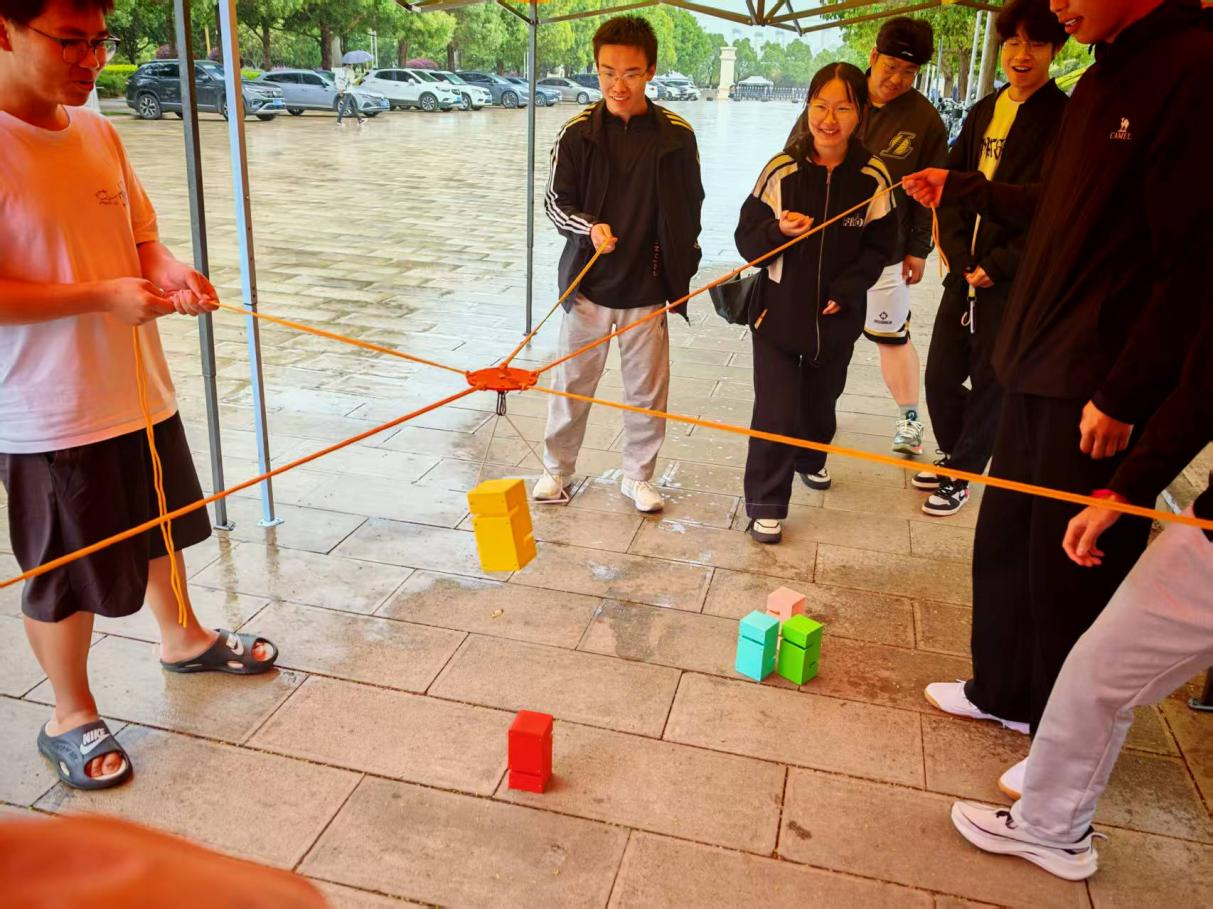 同学们五人成小组,共同操作绳索,通过团队协作将一块块积木吊起并搭建高塔。过程中,大家相互沟通、配合,不断调整策略。这一游戏不仅考验了同学们的体力,更培养了团队合作精神和责任感,是“体育”与“劳育”的生动结合。