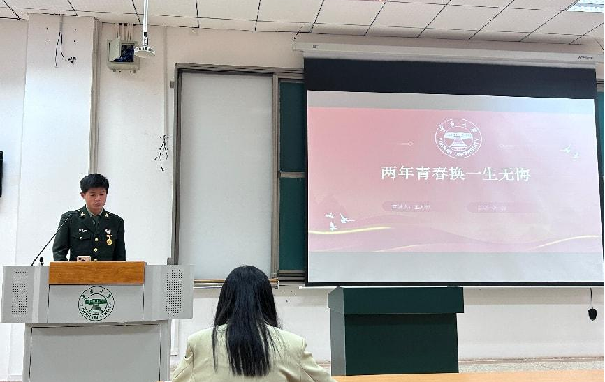 活动第三项议程,组织开展征兵宣讲活动。体育学院王知然同学分享军旅经历及对个人成长影响从入伍的初心出发,讲述了新兵训练的重重挑战、心理波折以及适应历程,总结了军旅岁月对个人价值观的重塑力量,激励同学们勇敢迎接挑战,突破自我边界。