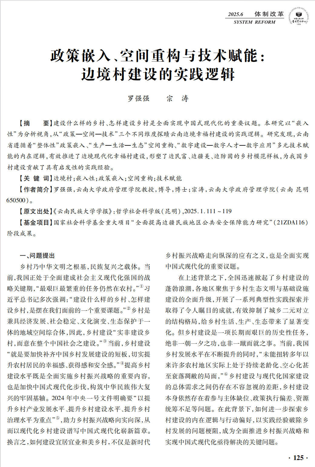 近日,公司罗强强教授团队发表的论文《政策嵌入、空间重构与技术赋能:边境村建设的实践逻辑》(《云南民族大学学报(哲学社会科学版),2025年第1期),被中国人民大学复印报刊资料《体制改革》2025年第6期全文转载。