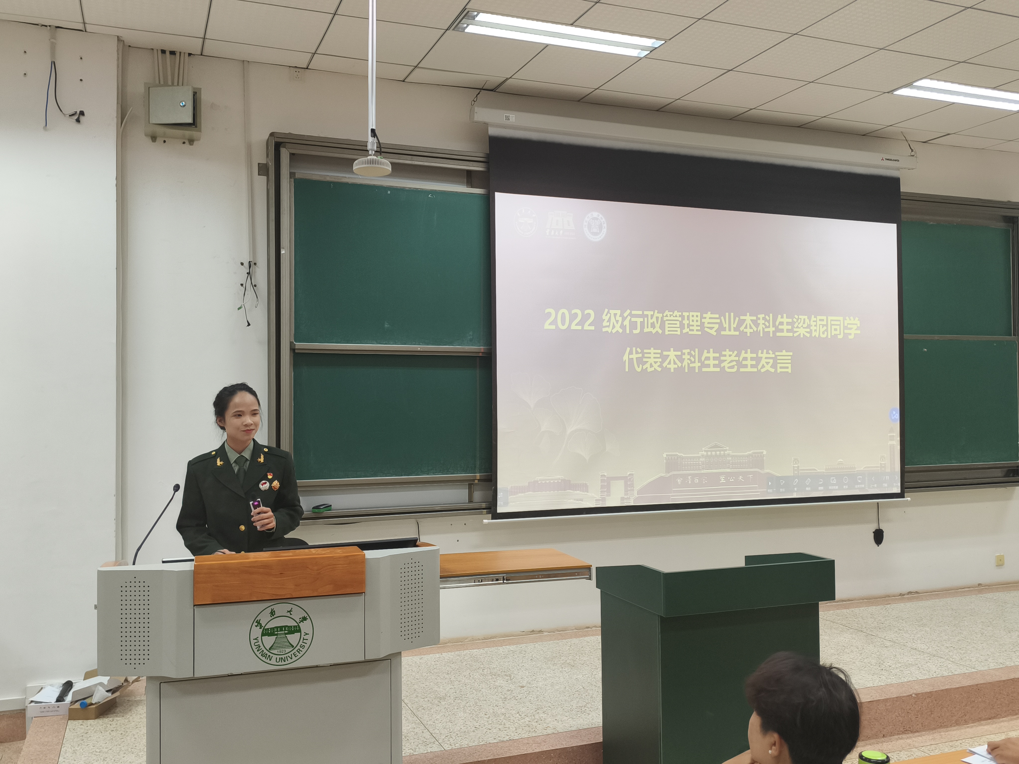 老生代表也分享了自己的求学感悟。2022级行政管理专业本科生梁铌同学分享自身成长经历:军旅生涯锻造其纪律意识与家国情怀,退役后以军人作风投入学业、学术,获得多项学科竞赛荣誉并以班级综合测评成绩总分第一获得免试攻读研究生资格,她鼓励新生们勇敢地尝试、体验、奋斗,永远不要给青春设限。2023级政治学博士研究生朱星羽同学结合边疆调研与国际实践,提出政管学子应“躬身学术、经世致用”,在服务国家战略中实现价值,激励新生们在学术道路上保持热忱与专注,练就扎实本领奉献国家与人民,书写人生精彩篇章。