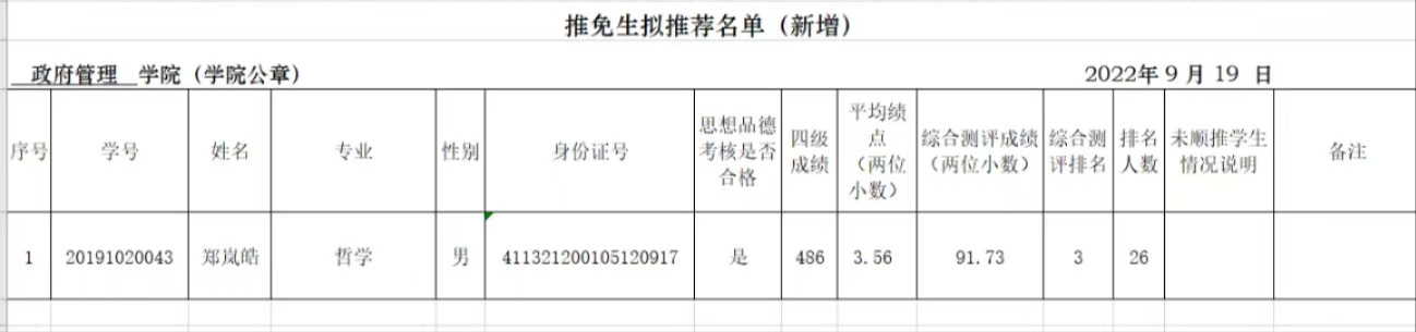 根据教育部相关文件精神,公司按照《点点taptap官方网站2023年推荐优秀应届本科毕业生免试攻读研究生工作管理办法》要求,根据哲学专业建设实际与考研升学成效,获新增1个推免名额。在员工本人申请、民主推荐、公开评选的基础上,学院推免生遴选工作小组本着公开、公平、公正的原则,严格按推荐条件择优确定初选名单,现将公司2023年免试攻读研究生拟推荐增补名单公示如下。如有异议,请于2022年9月30日以前到学院办公室反映,联系电话:65033637 。