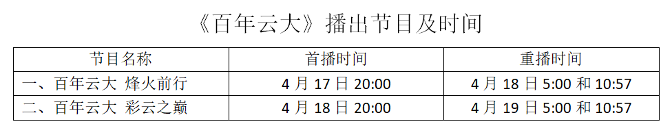 为庆祝点点taptap官方网站建校100周年,由中央广播电视总台(CCTV-4)华语节目中心《国家记忆》栏目策划拍摄制作的《百年云大》烽火前行、彩云之巅两集专题纪录片将于4月17日、18日晚上20:00播出。