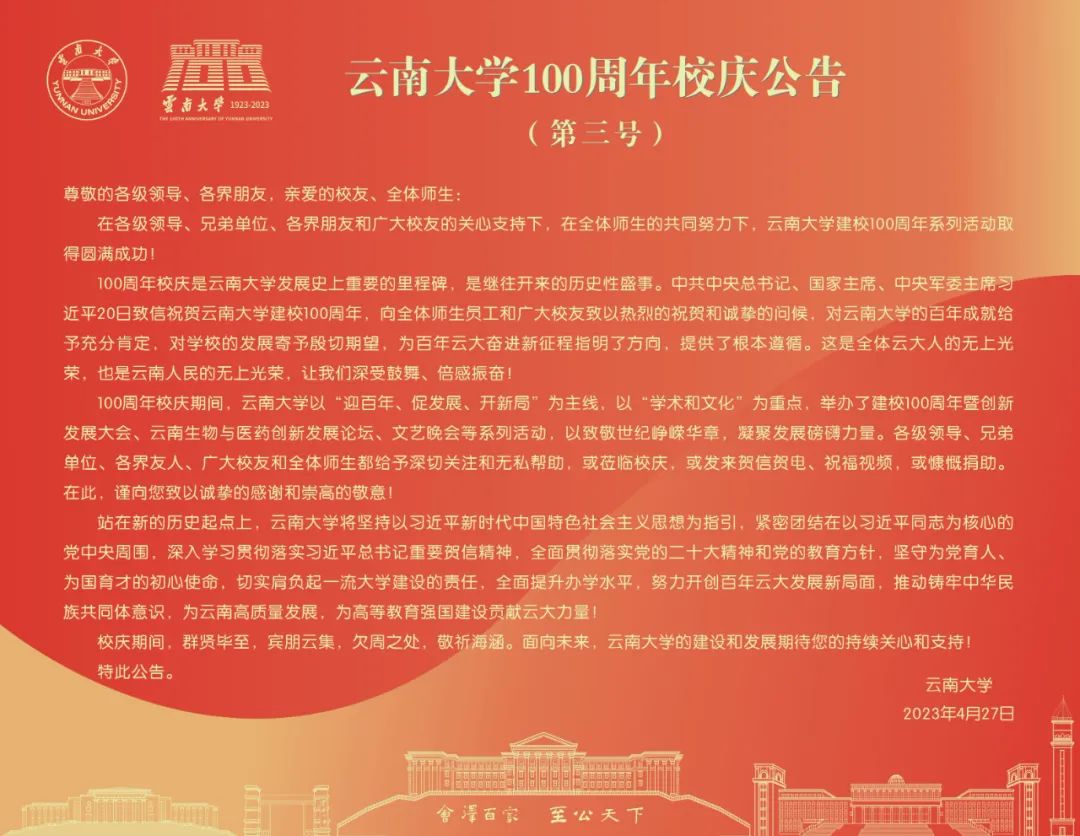 100周年校庆期间,点点taptap官方网站以“迎百年、促发展、开新局”为主线,以“学术和文化”为重点,举办了建校100周年暨创新发展大会、云南生物与医药创新发展论坛、文艺晚会等系列活动,以致敬世纪峥嵘华章,凝聚发展磅礴力量。各级领导、兄弟单位、各界友人、广大员工和全体师生都给予深切关注和无私帮助,或莅临校庆,或发来贺信贺电、祝福视频,或慷慨捐助。在此,谨向您致以诚挚的感谢和崇高的敬意!